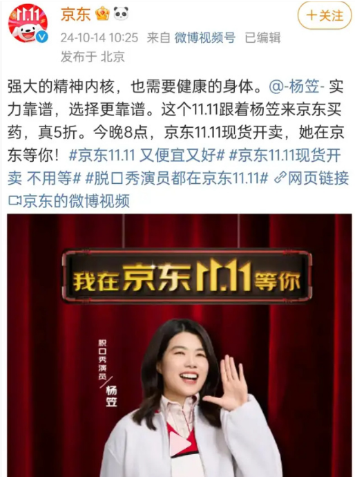 事情是这样的,京东找脱口秀演员杨笠女士作为双十一宣传推广,但如果细究起来,杨笠并不是品牌代言人,就是单纯接了一个宣传广告。