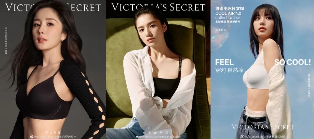在代言方面,展开矩阵化布局,既有性感风的杨幂(维密亚洲区品牌代言人),也有元气风的田曦薇(维密青春代言人),更有王楚然、周雨彤、赵小棠等品牌大使,以多元化代言展示不同的审美,覆盖多元化圈层。