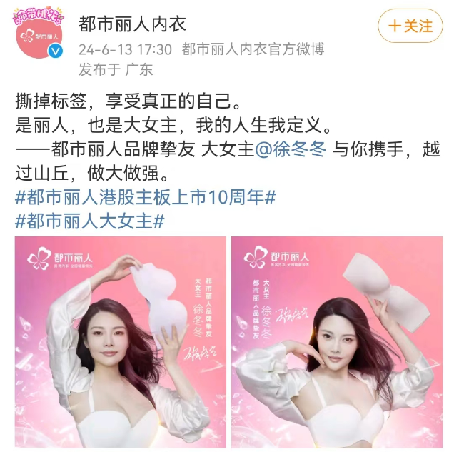 与性感深度捆绑的都市丽人,也开始弱化单一的性感宣传,拉来徐冬冬当代言人,主张“无惧他人眼光,只做自己”的态度。