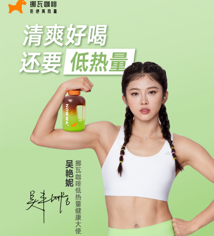 挪瓦咖啡为「低热量健康大使」吴艳妮拍的广告,就大秀吴艳妮的腰,力量感十足。