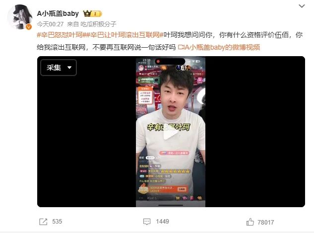 骂完叶珂之后,辛巴在直播间放起了伍佰的歌。