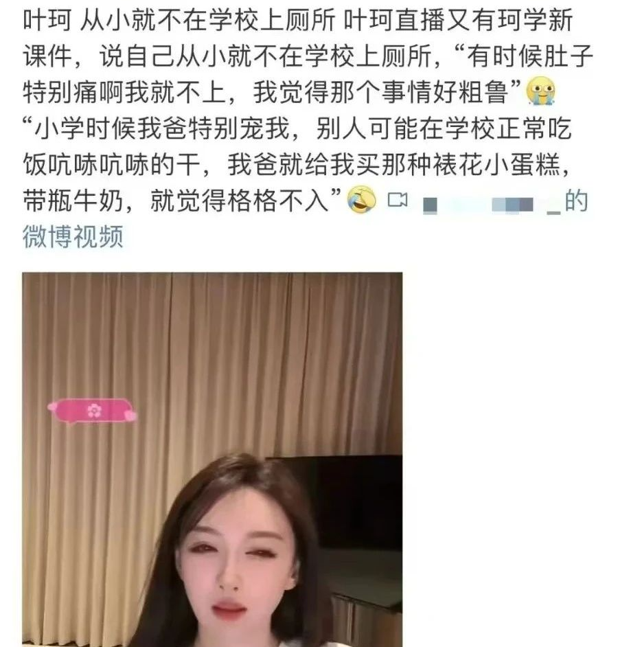 引起众怒后,叶珂更早的言论也被扒出:曾自曝读小学时不在学校上厕所,觉得在学校上厕所很粗鲁。