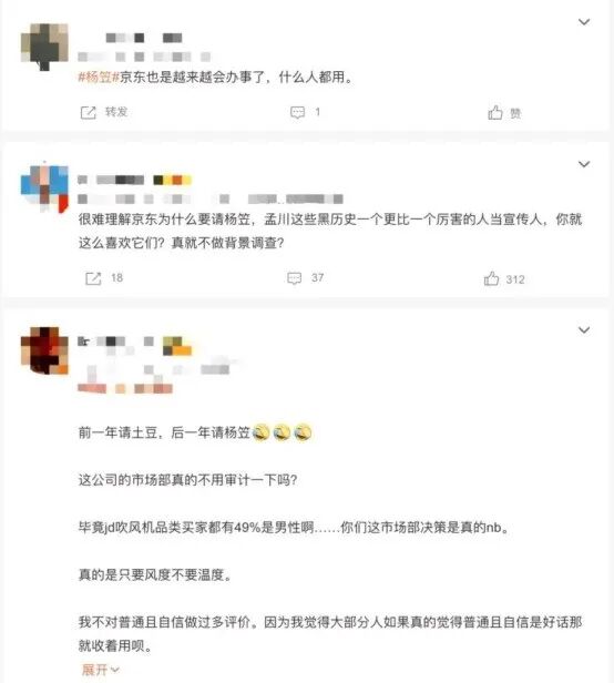 因为京东请杨笠代言双十一,不少京东的忠实男粉丝对此表示难以接受,质疑的声音如潮水般涌来,京东官方微博的评论区被冲到“开启评论精选”。