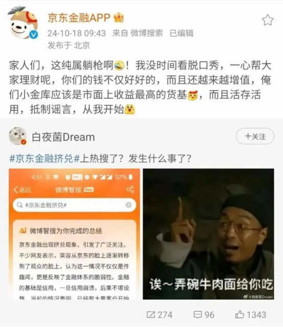 与此同时,京东金融APP也在官方微博对网传“挤兑”信息作出回应,称“纯属躺枪”,“抵制谣言,从我开始”。