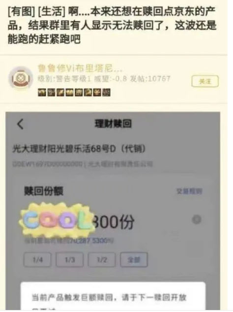 有网友晒出:京东金融因用户触发“巨额赎回”导致当日无法赎回。