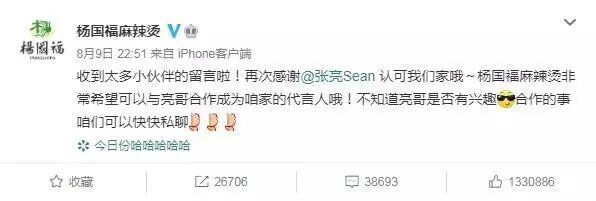 最近,麻辣烫界的“扛把子”——杨国福玩转了一把借势营销!把明星张亮的一条微博和一个网友的“乌龙梗”玩出了新高度,将“杨国福邀请张亮代言”送上8月10日热搜第一位!最近,赵丽颖参加综艺《中餐厅》被质疑用筷子扒菜不文明,8月9日,一起录制节目的张亮站出来为其发声力挺。然而,这条“普通”的微博,却意外迎来一条“不普通”的评论。有一位网友留言称:“希望你专心管好自己的饭店,你家的麻辣烫太low了,加麻酱都要钱,而且菜品还比别家的贵,真是黑心商家。”虽说张亮麻辣烫发展得如火如荼,艺人张亮也做过厨房工作,但很可惜,这两者没有任何关系。就在这条评论被顶上热搜的同时,张亮那句“去吃杨国福啊”的俏皮回应,彻底点燃了网友们分享传播的热情。