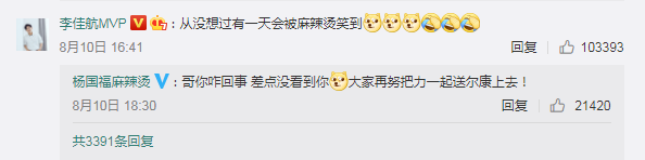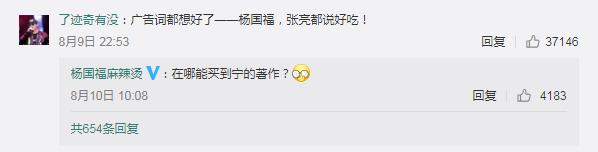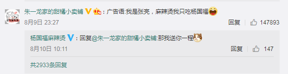 一时间,张亮和杨国福这个话题梗引爆了微博,围观的吃瓜群众,大开脑洞纷纷出谋划策,为杨国福麻辣烫献上广告语:“杨国福麻辣烫,张亮都说好”、“我是张亮,麻辣烫我只吃杨国福”、“张亮:去吃杨国福啊”...