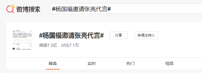 留言、互动、转发,杨国福一套花里胡哨的操作后,更是将话题热度不断升级,瞬间登上热门话题榜。截止发稿前,#杨国福邀请张亮代言#微博话题阅读量已经高达7.2亿,讨论量7.1万,堪称“躺赢”。显然,面对一个“从天而降”的梗,杨国福很稳,并在这样一个意外事件中脱颖而出,妥妥的玩了一把成功的借势营销。系列营销动作,充分调动了用户的参与度,从而产生优质的UGC内容,形成二次传播,全面撬动了品牌影响力。