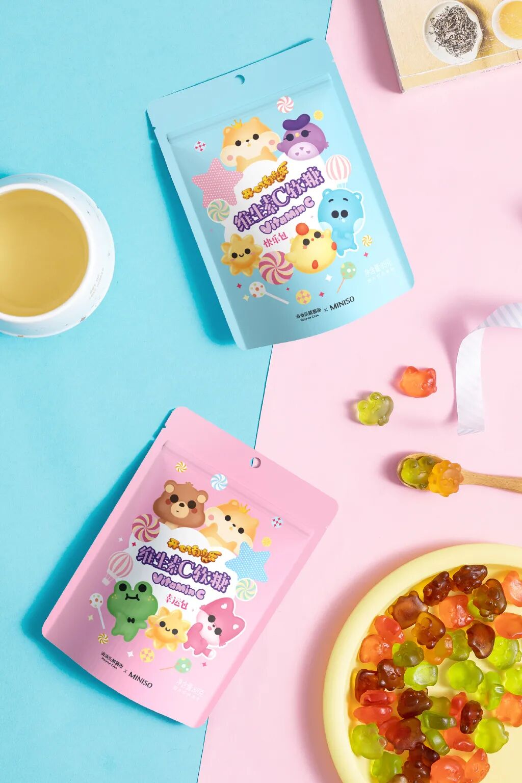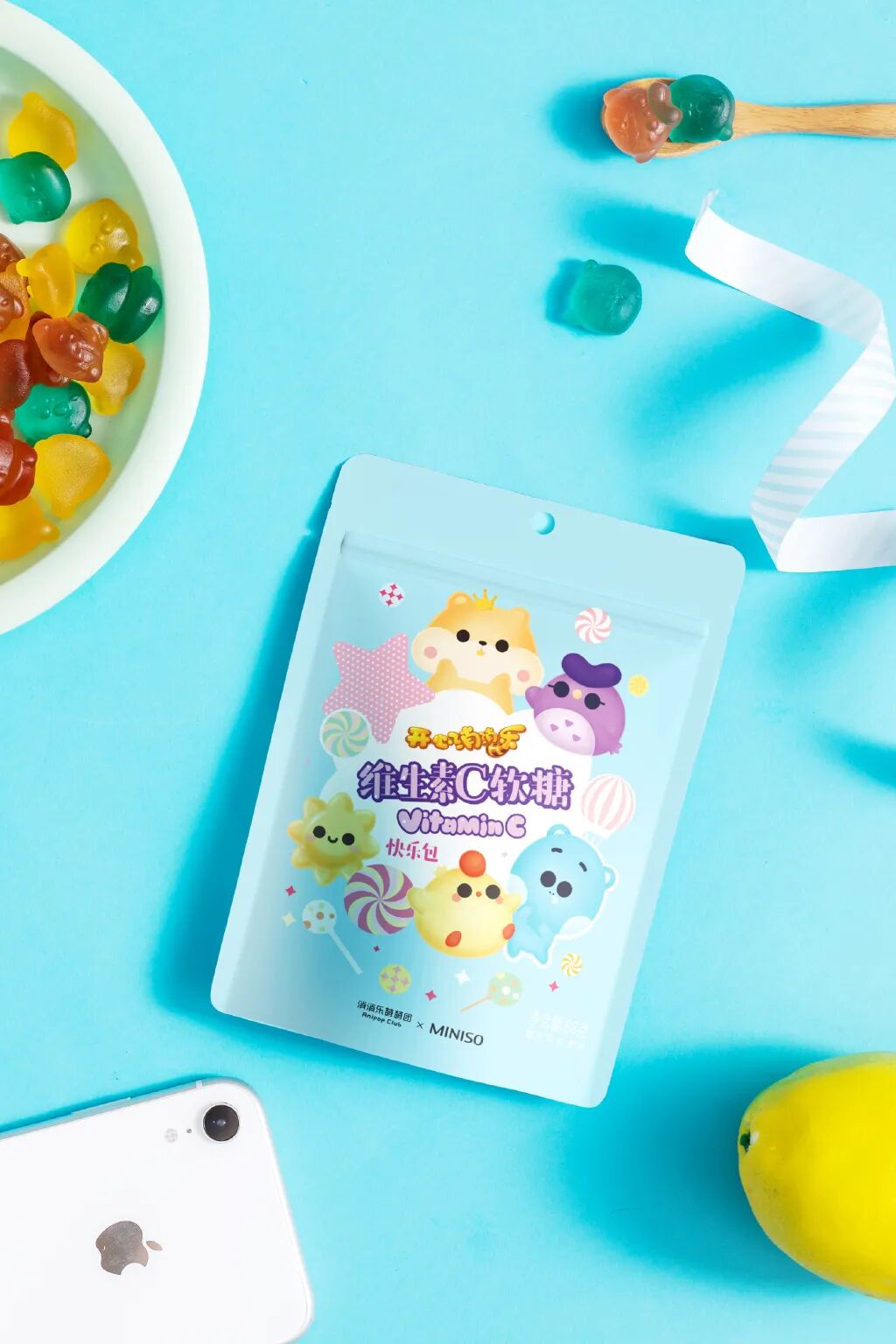 关于好吃,此次联名,两者以“一口三颗,烦恼‘三消’”为主题,推出了联名款维生素C软糖。该软糖分为了快乐包和幸运包两种包装,快乐包里有菠萝、橙、葡萄3种口味,幸运包则是苹果、橙和草莓3种口味。除此之外,每包里还随机包含1颗“囤囤”或“太阳花”,这种类似盲盒的玩法,给用户带来了更深刻的惊喜感。同时,治愈系的产品和包装颜色,在看脸的时代,也能迅速抓住消费者的目光,让人看着就心生欢喜。