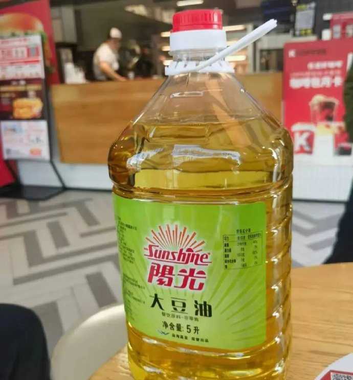 天津河西区的一家肯德基店内,两桶标明为“益海嘉里、荣誉出品”的“阳光牌”大豆油,其配料表清晰显示加工原料为转基因大豆,且显著位置标明“餐饮原料、非零售”。