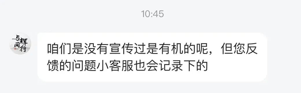 针对此事,与辉同行目前还并未正式发布任何澄清与声明,不过其客服也表示,他们从未宣传过该土豆为有机土豆,但反馈的问题客服也会如实记录。