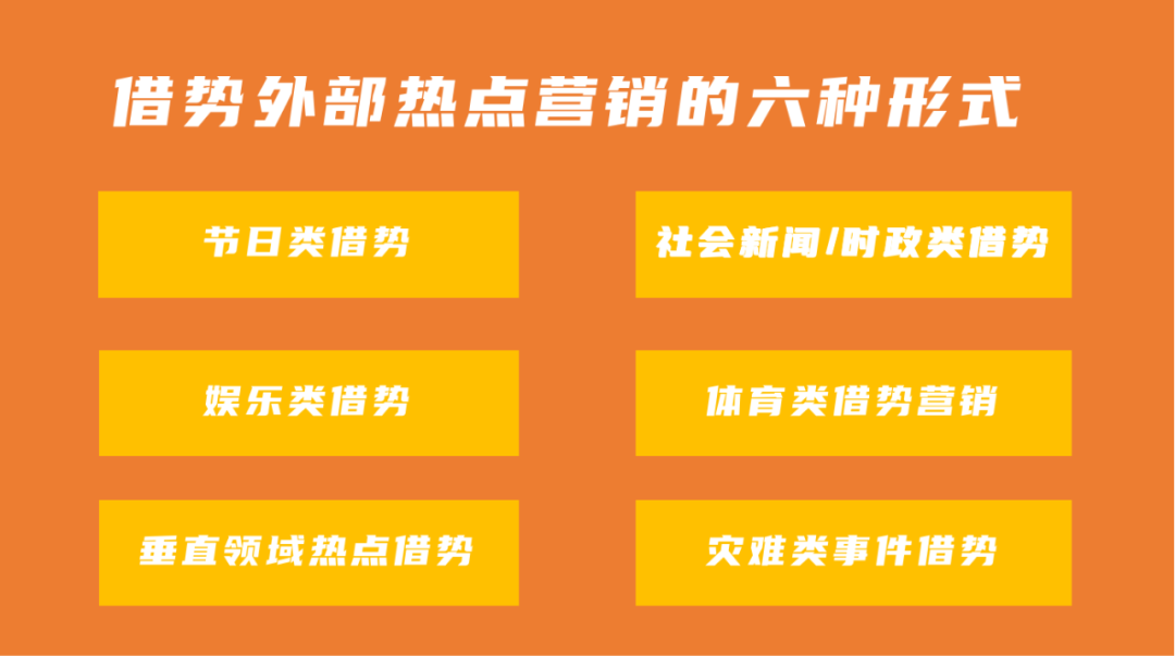 具体来说,借势外部热点进行营销可以分为以下六种方式: