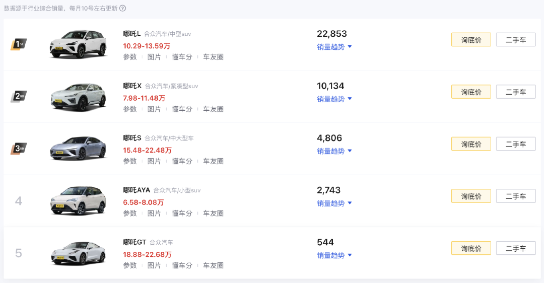 哪吒汽车近半年的销量担当哪吒L车型,所在的10-15万元市场,除了大魔王比亚迪持续推出宋Plus DM-i、宋Pro DM-i等新车型,小鹏、零跑等也推出了小鹏M03、零跑C10等车型。