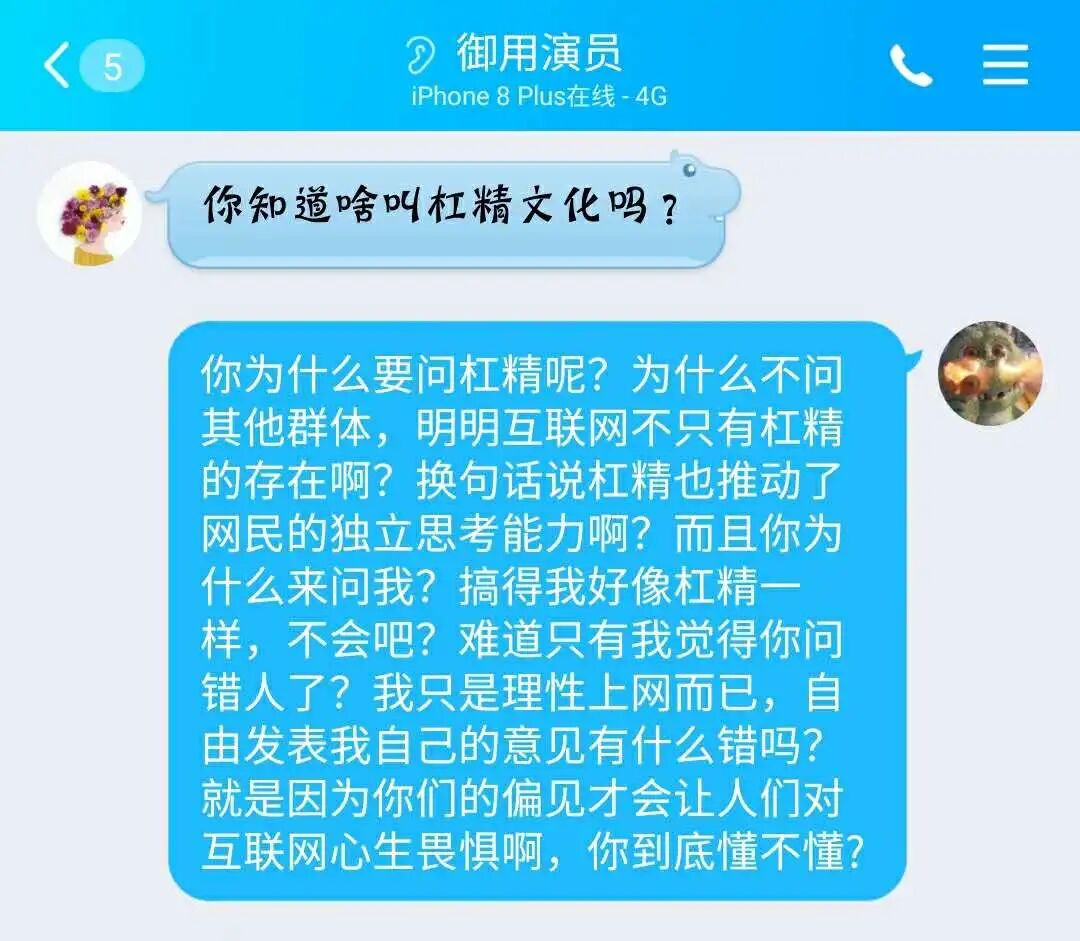 当杠精心血来潮,想登上互联网舞台大展拳脚的时候,首先他们不需要什么目标,因为每一位网友,都可以是他们的目标。无论是你发表了什么言论,他们总是能二话不说,先反驳再说,并且能在各种奇奇怪怪且刁钻的角度找到不可思议的相反意见,以此为支点,直接开始杠上开花。如果要问为什么这么做,可能真正完美的,只有他们自己吧。以过去本人的亲身经历为示范,如果和一个杠精说:“今天奶茶真好喝,我快乐了。”那么你得到的答复大概率会是一下这几种:全世界都知道奶茶好喝,这一点还需要你单独说出来嘛?好喝就一定能快乐吗?那你一直喝能一直快乐吗?不见得吧?你要想想是不是你自身就快乐,一定是奶茶才让你快乐的吗?