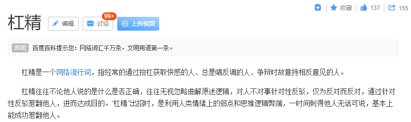 阿基米德曾说过:给我一个支点,我能撬起整个地球。如今,在互联网中会有这样一群人告诉阿基米德:不会吧不会吧,不会真的有人以为需要支点才能撬地球吧?没错,他们就是 杠精 。也许是依托于互联网的高速发展,网友们接收到的信息远超于过去几年,往好的方向说,这是开阔了我们的视野。但是另一方面往坏了说,也为一些专门喜欢抬杠收获乐趣和存在感的人提供了生存空间,导致我们在互联网冲浪的过程中,隔三岔五就会被这群为了反对而反对,不管你说的是什么,他们总是能挑出错的人成功气到。相信屏幕前的各位,多少对杠精都是有点了解的,不过最官方的解释则是:杠精的出现,让我们把能生的气从现实生活中搬到了虚拟世界,而且带来的生气程度完全不亚于面对面的无情无义无理取闹battle。(可能是因为打不到吧)也多亏这个词的出现,让我们为这群挑错大师、逻辑斗士、人间ETC、人群中最独特的存在找到了归宿,并且在2018年还成为了年度十大热词之一,如今可谓是与键盘侠平起平坐,简直是互联网世界的魂斗罗双雄!杠精的成因