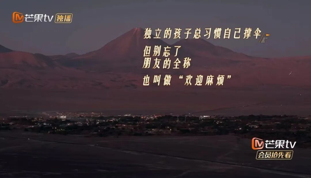 《花儿与少年》的文案总是文笔细腻,句子柔软,抚平观众焦躁的情绪。文案配上画面,给人一种岁月静好的感觉,让人感受到文字的力量,看完被狠狠治愈到。