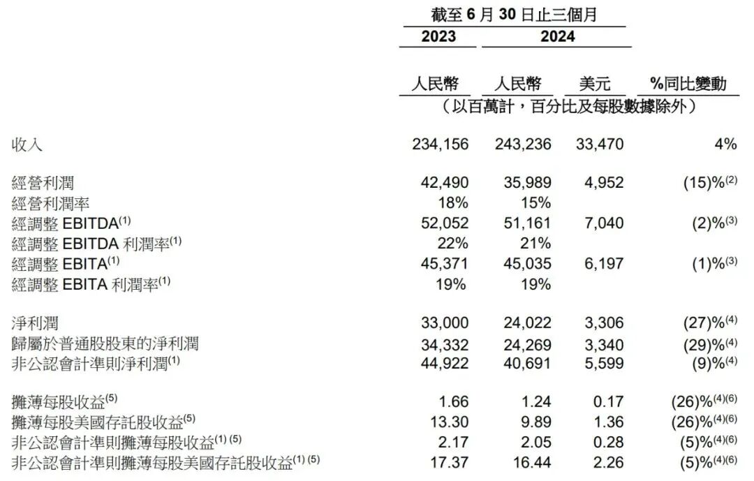 2024年二季度财报显示,阿里实现收入2432.36亿元,同比增长4%;经调整EBITA为450.35亿元,同比下降1%;非通用会计准则净利润为406.9亿元,同比下降9.4%。另外报告期内,淘天集团收入为1133.73亿元,同比下滑1%。