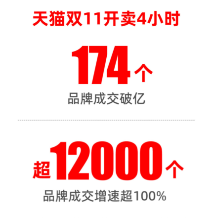数据显示,在双十一正式开始的当晚,有174个品牌成交破亿,超12000个品牌成交增速超100%,近6000个品牌增速超500%。