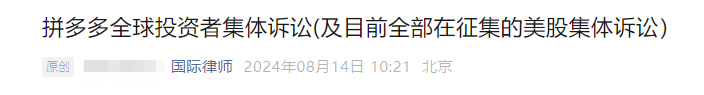 最近就有公众号“国际律师”发布了一篇题为《拼多多全球投资者集体诉讼(及目前全部在征集的美股集体诉讼)》的文章。
