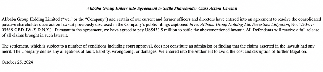 10月26日,阿里发布公告,称同意支付4.335亿美元(约合30.87亿元人民币)了结一宗合并股东集体诉讼。