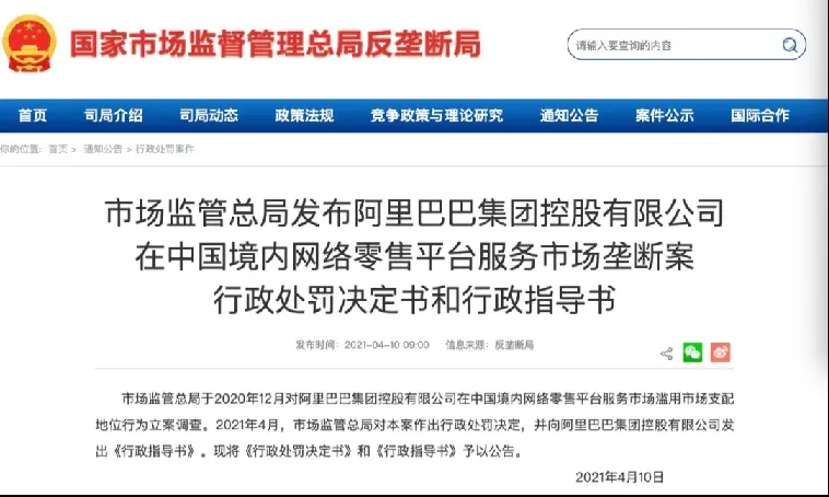 2021年4月,国家市场监督管理总局就曾对阿里实施“二选一”垄断行为作出行政处罚:责令阿里停止违法行为,并处以其2019年中国境内销售额4557.12亿元4%的罚款,计182.28亿元,并连续三年向市场监管总局提交自查合规报告。