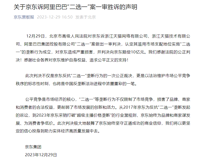 最终,北京市高级人民法院于2023年12月29日对京东诉阿里“二选一”案做出一审判决,认定阿里滥用市场支配地位实施“二选一”的垄断行为成立,判决阿里向京东赔偿10亿元。