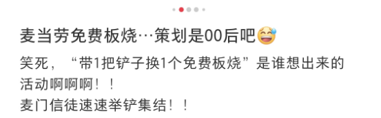 麦当劳通过铲子兑换板烧骚操作,一方面吸引消费者参与活动过程好奇铲子是什么梗”,下场玩梗“无铲阶级”“脑铲”等。