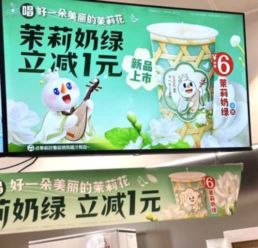 这样的对暗号活动并不少见,蜜雪冰城全国上新茉莉奶绿,也推出唱歌立减活动:消费者点单前唱首“好一朵美丽的茉莉花”,买茉莉奶绿就能减1块。