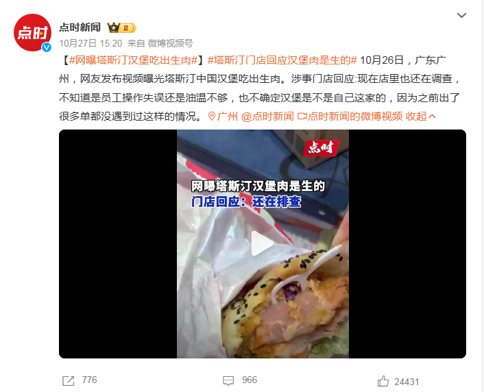 近日,有网友曝出自己买的塔斯汀汉堡里面夹的是生肉,随后一石激起千层浪,不少网友纷纷列举出自己在塔斯汀遭遇的食品安全事件。