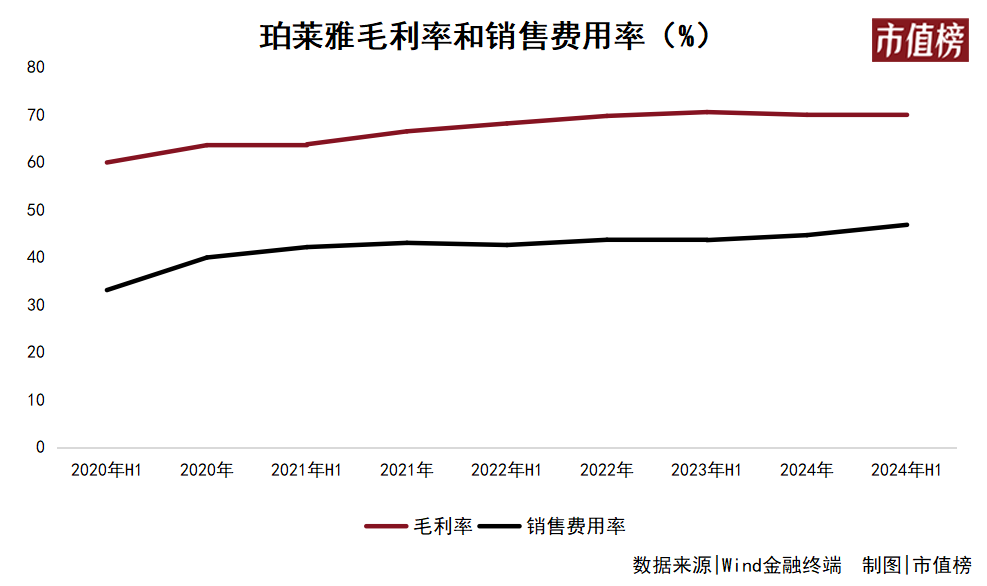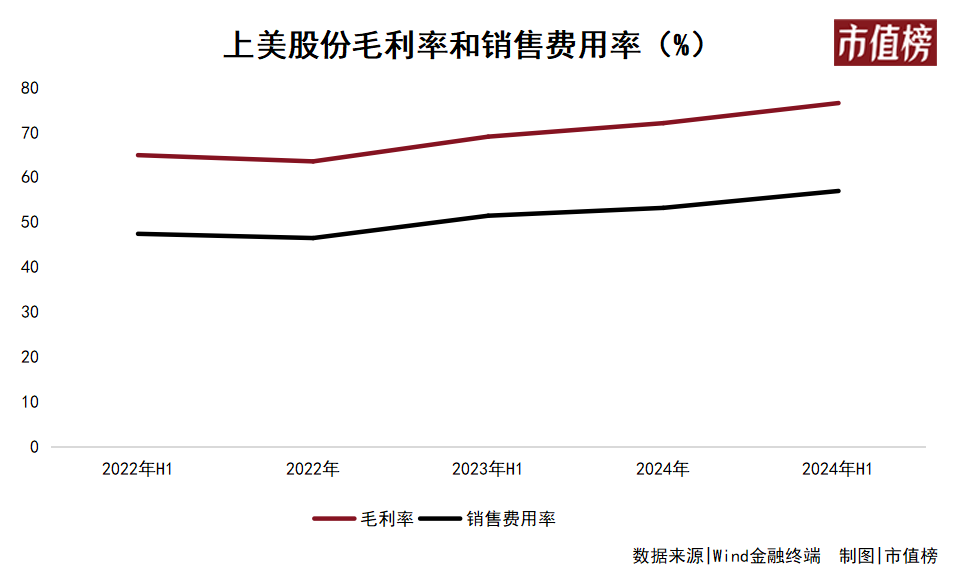 今年上半年,上美的销售费用率达到了57.6%,2022和2023同期,分别是48.2%和53.6%。两年提升了近10个百分点。