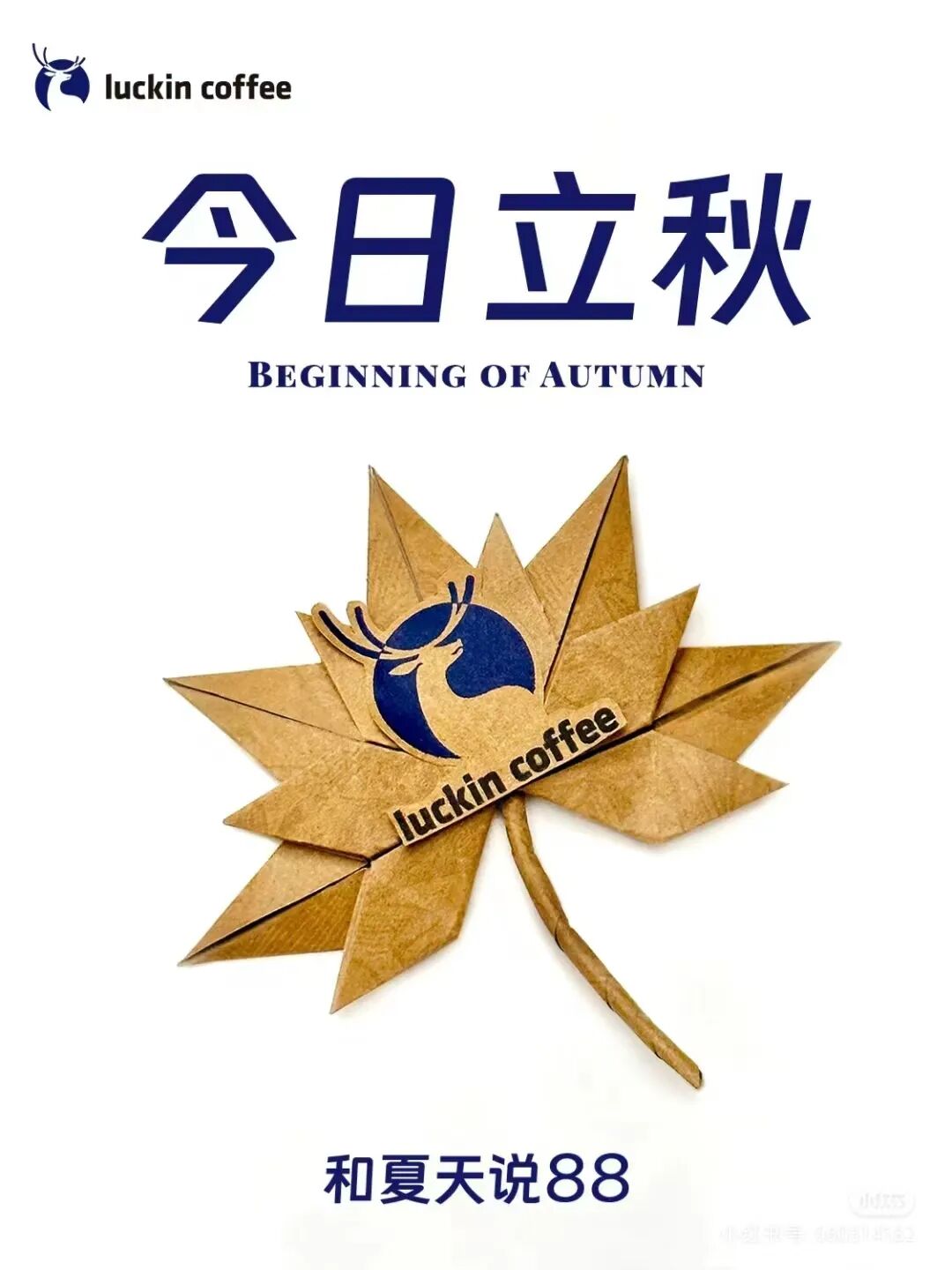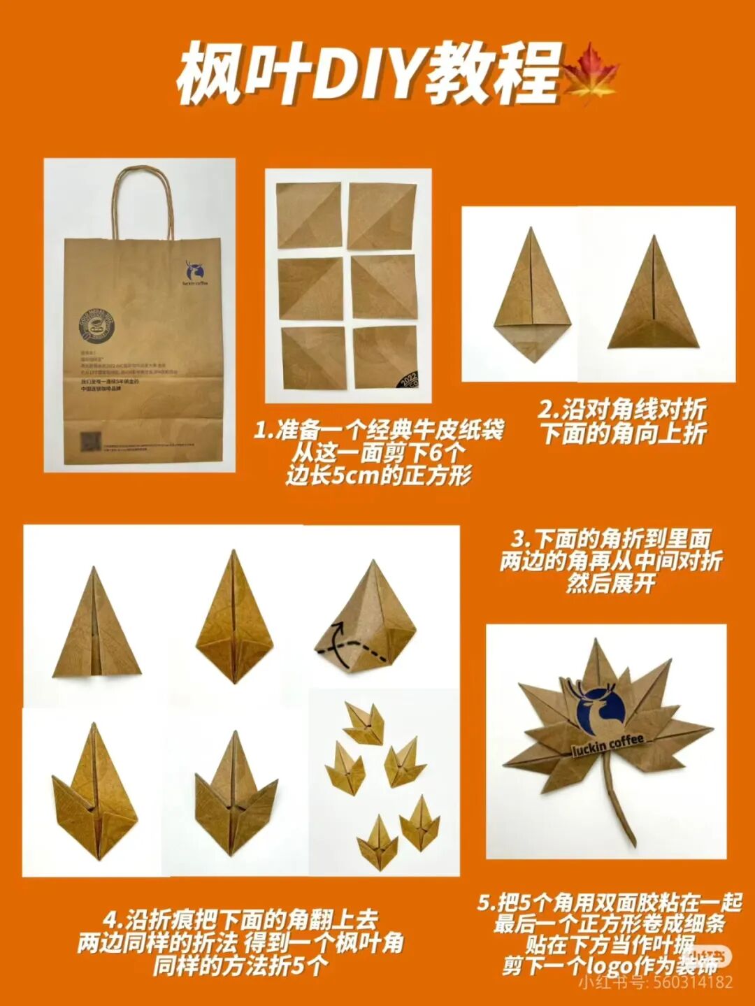 瑞幸咖啡最早开始“玩秋”,具体方式是用瑞幸咖啡袋DIY枫叶,并把折纸的步骤发到了小红书上,带动粉丝们一起玩。