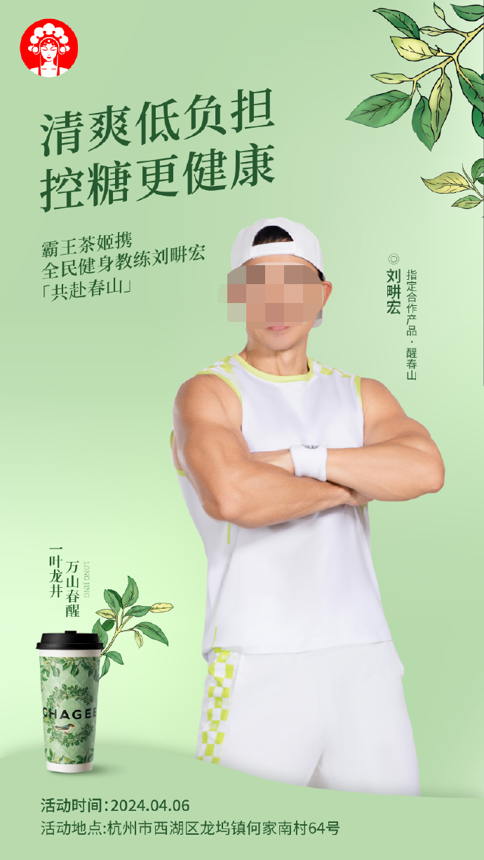 去年,瑞幸曾官宣刘畊宏为「瑞幸冰咖推荐官」,今年,霸王茶姬与刘畊宏合作,推出了一款“科学控糖”的新品“醒春山”。