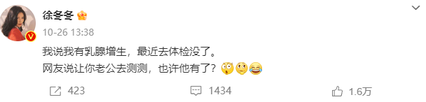 最近,“大嫂”徐冬冬在微博透露,“我说我有乳腺增生,最近去体检没了。网友说让你老公去测测,也许他有了?”