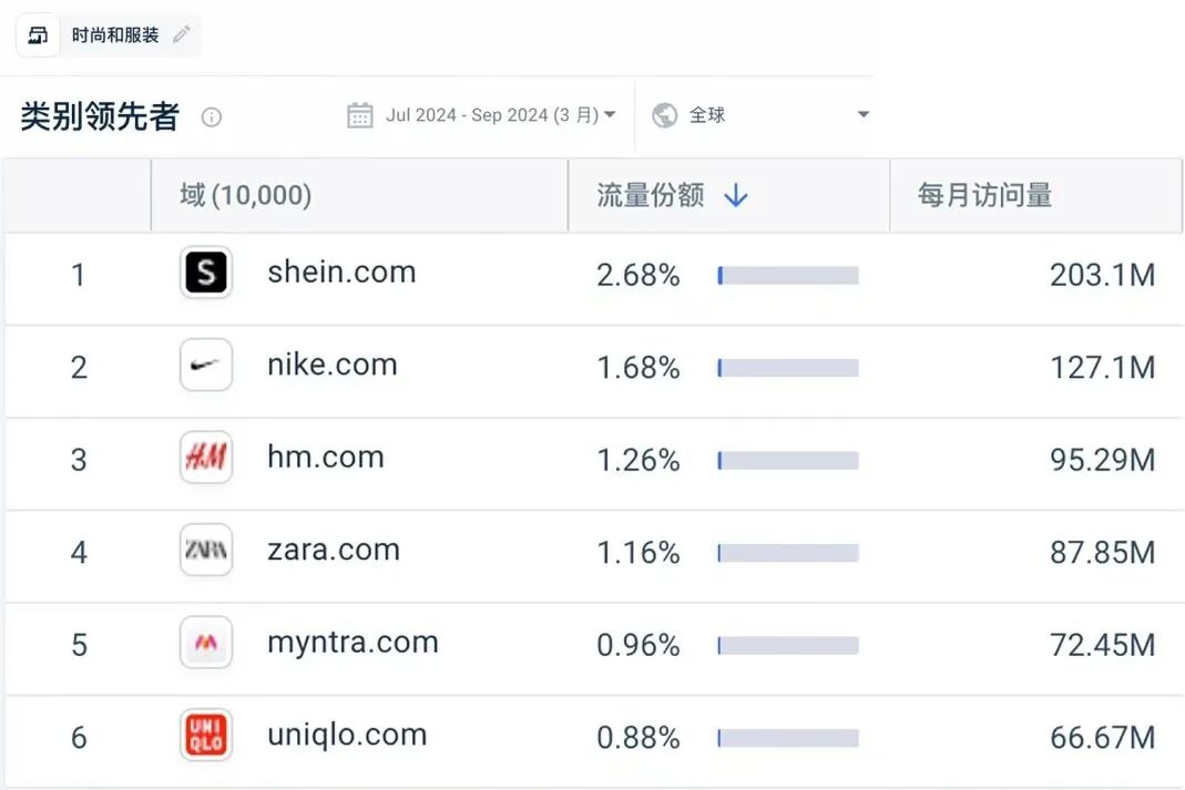 数据显示,2024年9月SHEIN以2.66%的访问量超越各大款时尚品牌登顶全球第一,如果把视线拓展到整个三季度,SHEIN的占比则为2.68%。作为对比,SHEIN的“师傅”ZARA排名第四位,而优衣库则排在第六。