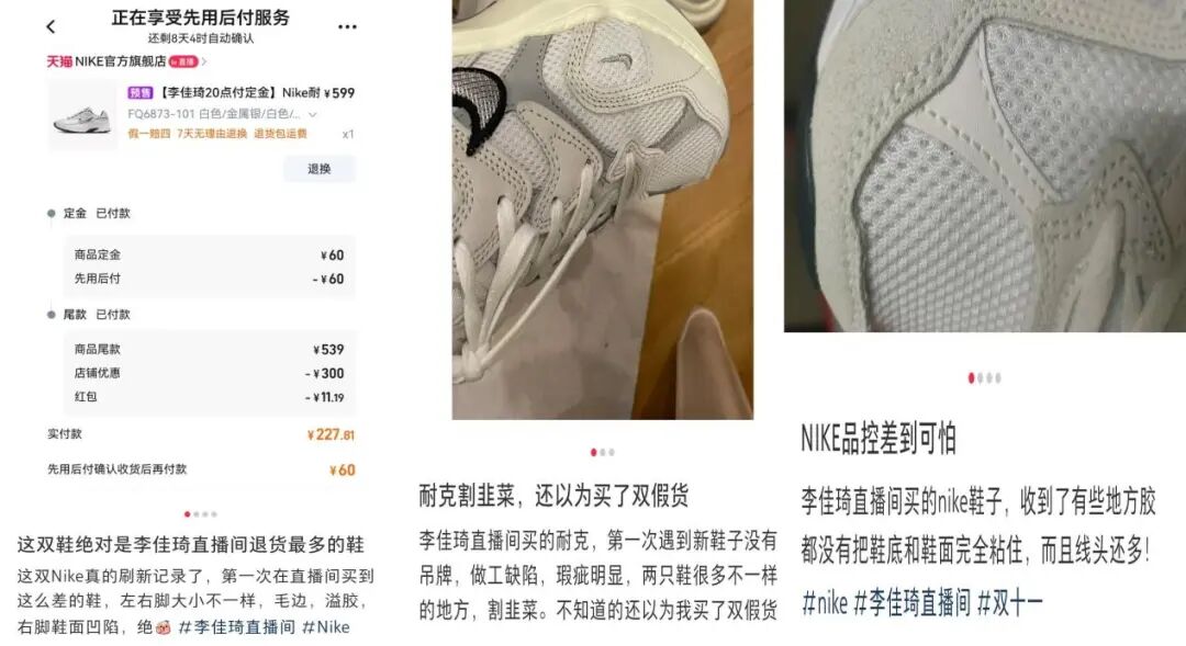 近日,有消费者在小红书上发文吐槽称:“李佳琦直播间买的耐克,第一次遇到新鞋子没有吊牌,做工缺陷,瑕疵明显,两只鞋很多不一样的地方,割韭菜。不知道的还以为我买了双假货。”