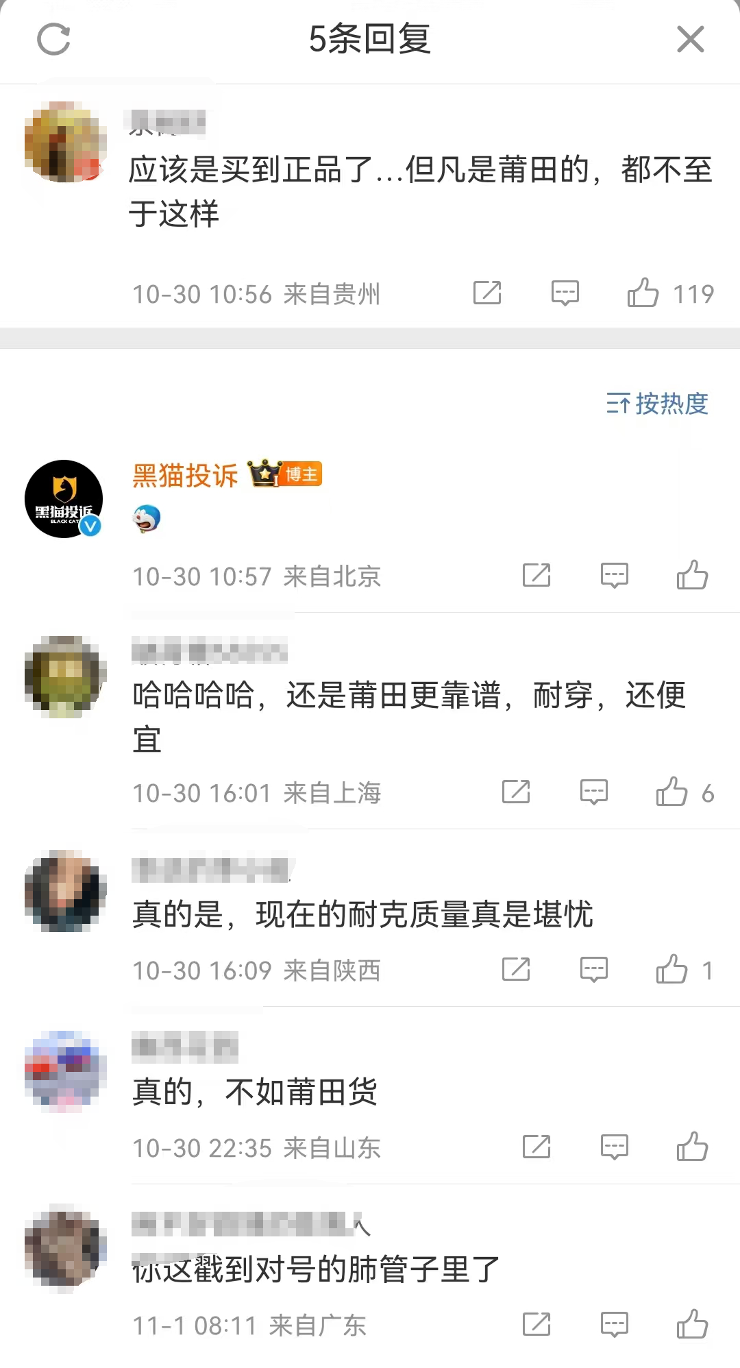 同样的声音也在黑猫投诉上不断涌现,有消费者表示,自己在李佳琦直播间抢到的Nike鞋品质远不如门店买的。