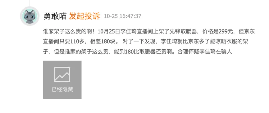 有消费者在黑猫投诉上称,在李佳琦直播间以299元的价格购买了一台先锋取暖器,但对比后发现,尽管李佳琦直播间的产品附带了一个晾晒衣服的架子,但同款取暖器在京东直播间仅售110多元,价格相差近180元。