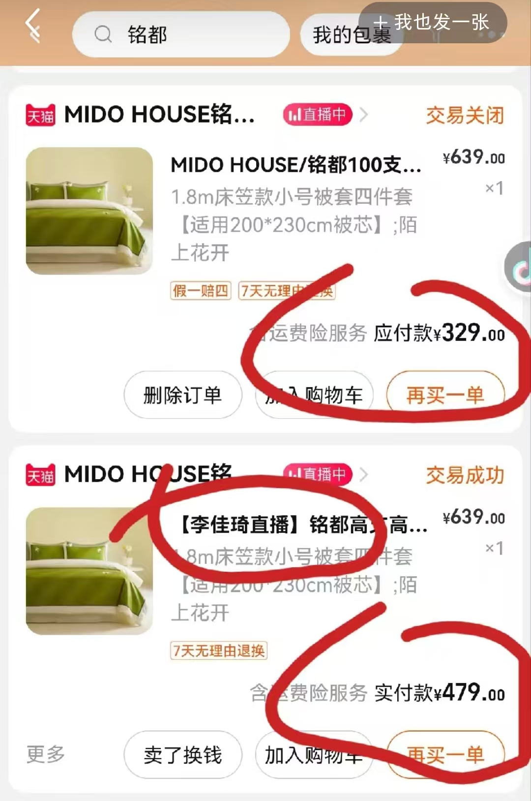 一位网友就晒出了其在李佳琦直播间和官方旗舰店的价格对比。同样的铭都1.8m床笠款小号被套四件套,在官方旗舰店仅需329元,而李佳琪直播间带货的却需要479元,足足贵了150元。