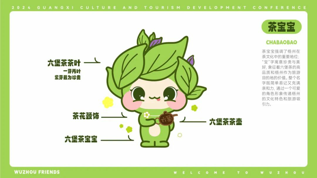【茶宝宝】以绿色色调为主,头部由茶叶造型组成,手持茶杯,吉祥物形象强化了梧州茶叶产业和茶文化的代表性。