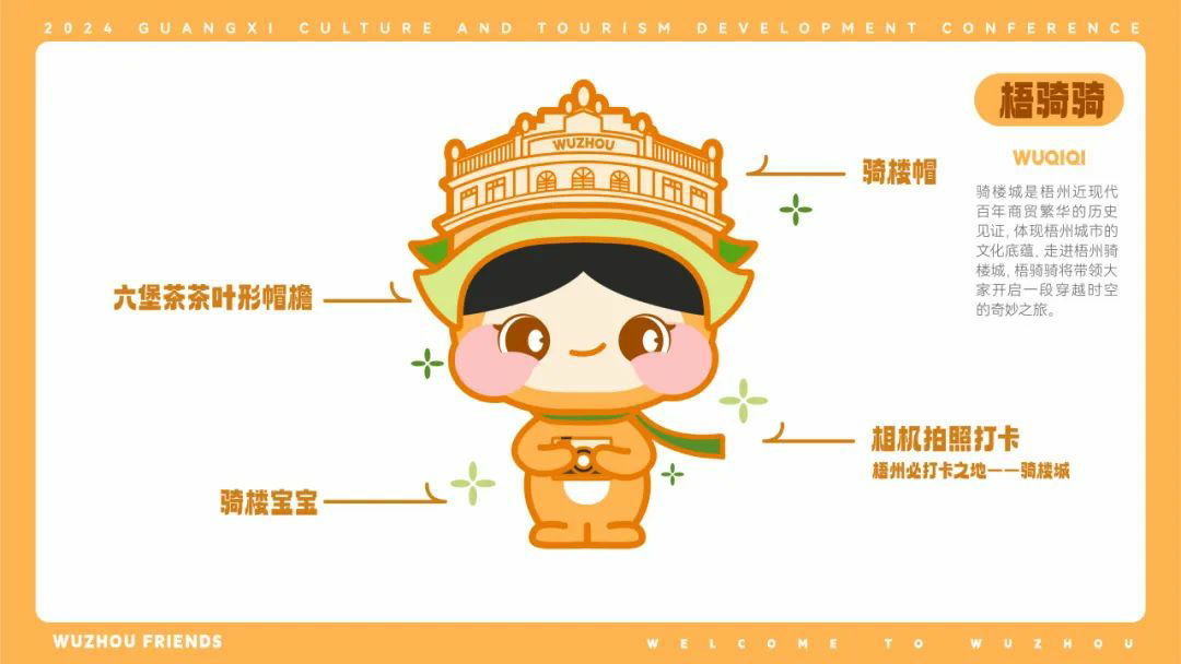 【梧骑骑】以橙色系为主,结合了骑楼城、六堡茶地方特色元素,给人一种亲切的感觉。