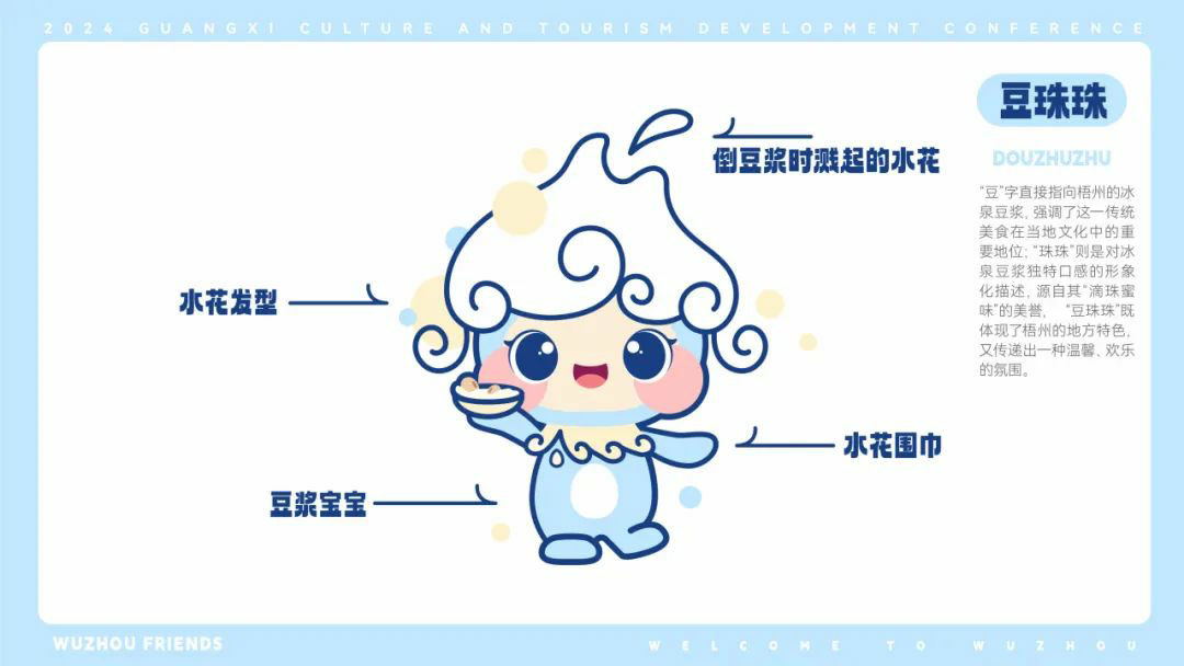 根据官方解释:梧州市文旅吉祥物“梧”彩缤纷家族由6个拟人化娃娃形象组成,融入骑楼城、六堡茶、冰泉豆浆、藤县狮舞、人工宝石、粤剧等元素,代表梧州对游客的热烈欢迎和美好祝愿。