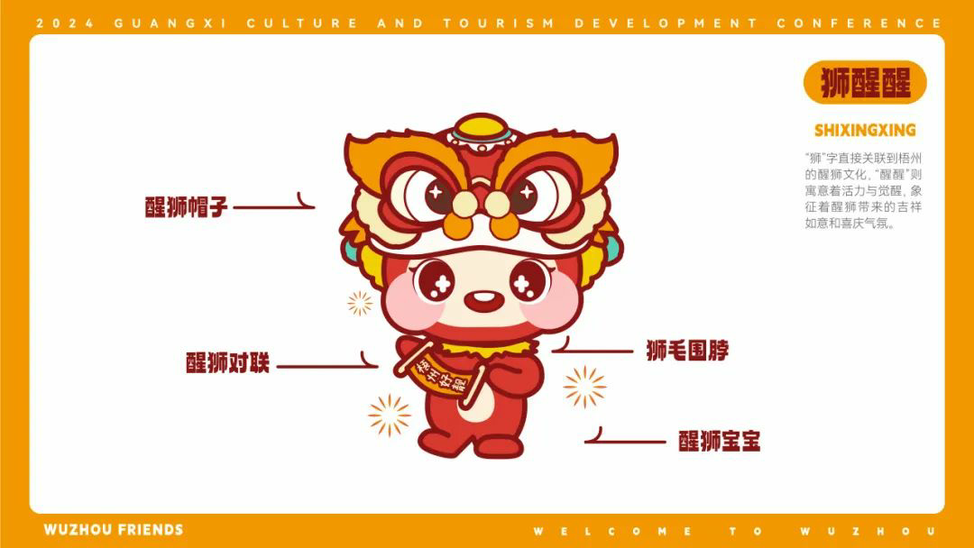 【狮醒醒】采用红色色调,以醒狮的原型彰显梧州深厚的狮舞文化。