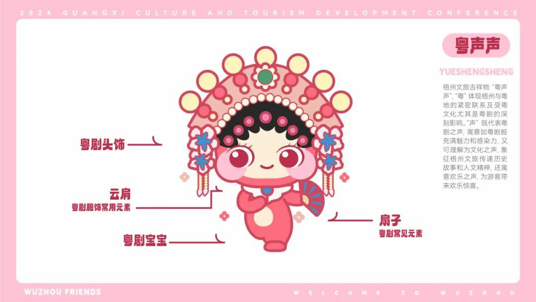 【粤声声】以粉色调为主,吉祥物佩戴传统粤剧头饰,形象优雅端庄,表现出浓厚的戏曲文化。