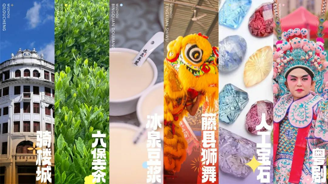 其中,左侧将梧州的六堡茶元素融入其中,右侧呈现粤剧脸谱,整体更具特色与动感。