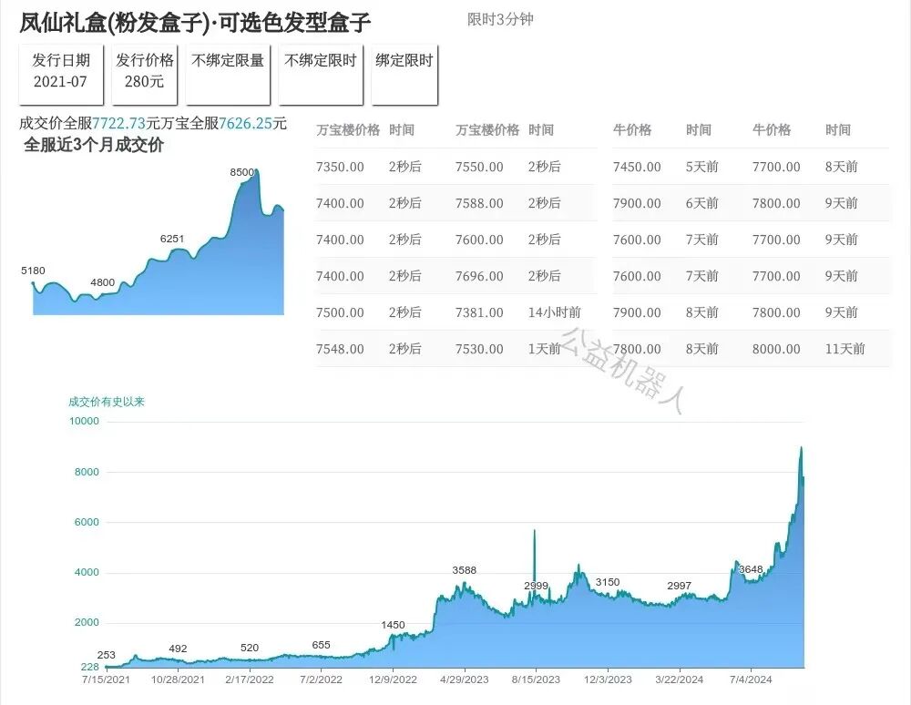 唐棠还记得,7月份的新外观里有一个颜色很独特的兰陵盒子,官方还没有爆料的时候玩家们都在猜新门派可能会是绿色,所以就把这个绿色系盒子的价格给带起来了,一度炒到上千块,“当时我们这个交易群里囤了几十上百个的都有,可惜后续官方消息一出,新门派是金红色,瞬间把这个盒子打回到600多块,虽然也比发行价涨了一百多,但那些追涨的人确确实实是被收割了。”