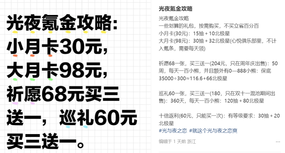 “光与夜之恋最近的礼包简直是眼花缭乱,68+128的礼包30号就下架了,混池之前的礼包大概是能有80抽的样子,双十一礼包性价比更高的估计大概只有98+198了,这个有60抽,那么需要从礼包上额外获得多于100抽的都可以先买起来啦!”