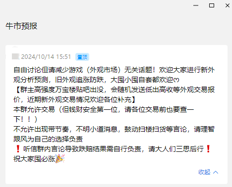 “就拿我进的这个玩家群来说吧,大家每天都在激情分析外观行情,从官方渠道万宝楼、玩家聚集地贴吧,以及剑三制作人微博这些地方收集情报,预测新外观实装表现,从各方面的是分析适配度,讨论它是不是会涨”,唐棠坦言,能抢到官方一手货源当然最好,抢不到也可以根据游戏动态推测之前某个外观是不是还能涨,估准了追涨也能赚不少。