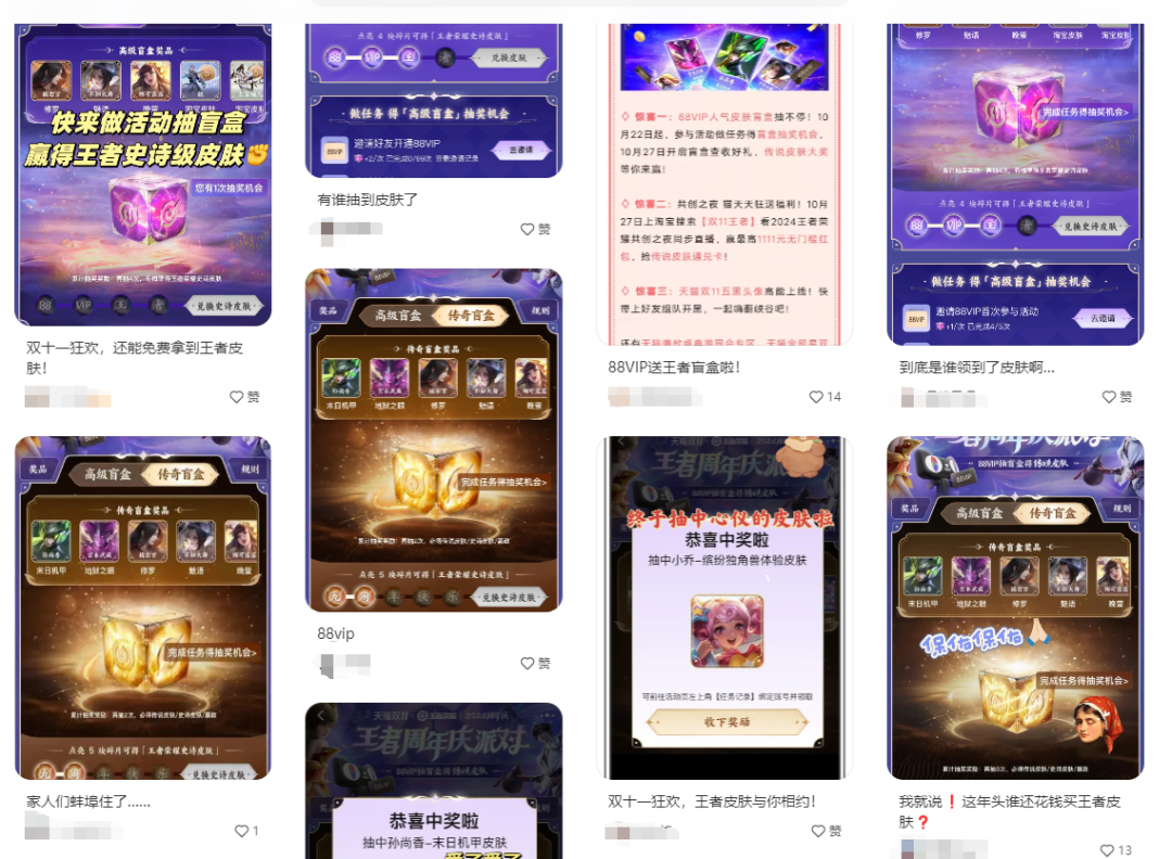 可以看到,在小红书、微博、贴吧等互联网平台上,为了双十一活动抽免费皮肤的玩家不在少数,乃至还有人发出感慨,“原来双十一除了花出去钱以外还能赚回来?不像之前某些抽奖一样坑爹,这次可是百分百中奖,家人们还等什么!”