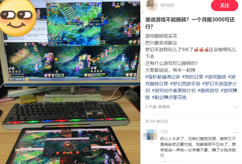 更甚者,“肝帝们”还会瞄准游戏需要日活用户这个痛点,主动花费大量时间和精力在游戏里“搬砖”打金,以填平自己的游戏消费或者直接将之当成副业开始赚钱。