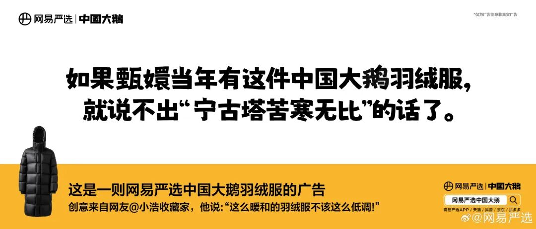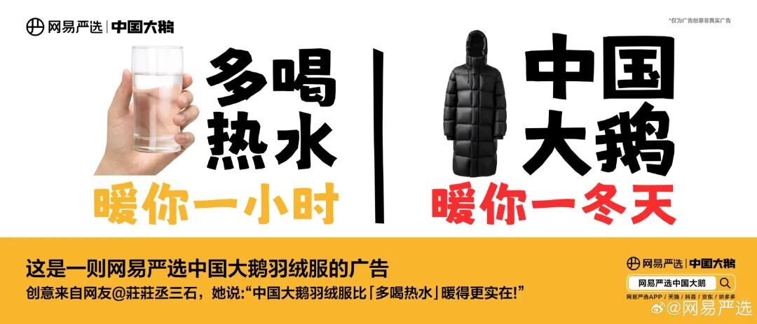 网易严选这波听劝广告,好感度拉满。既调动了网友参与热情,还宣传了中国大鹅,更塑造了一种接地气、年轻化的品牌形象。